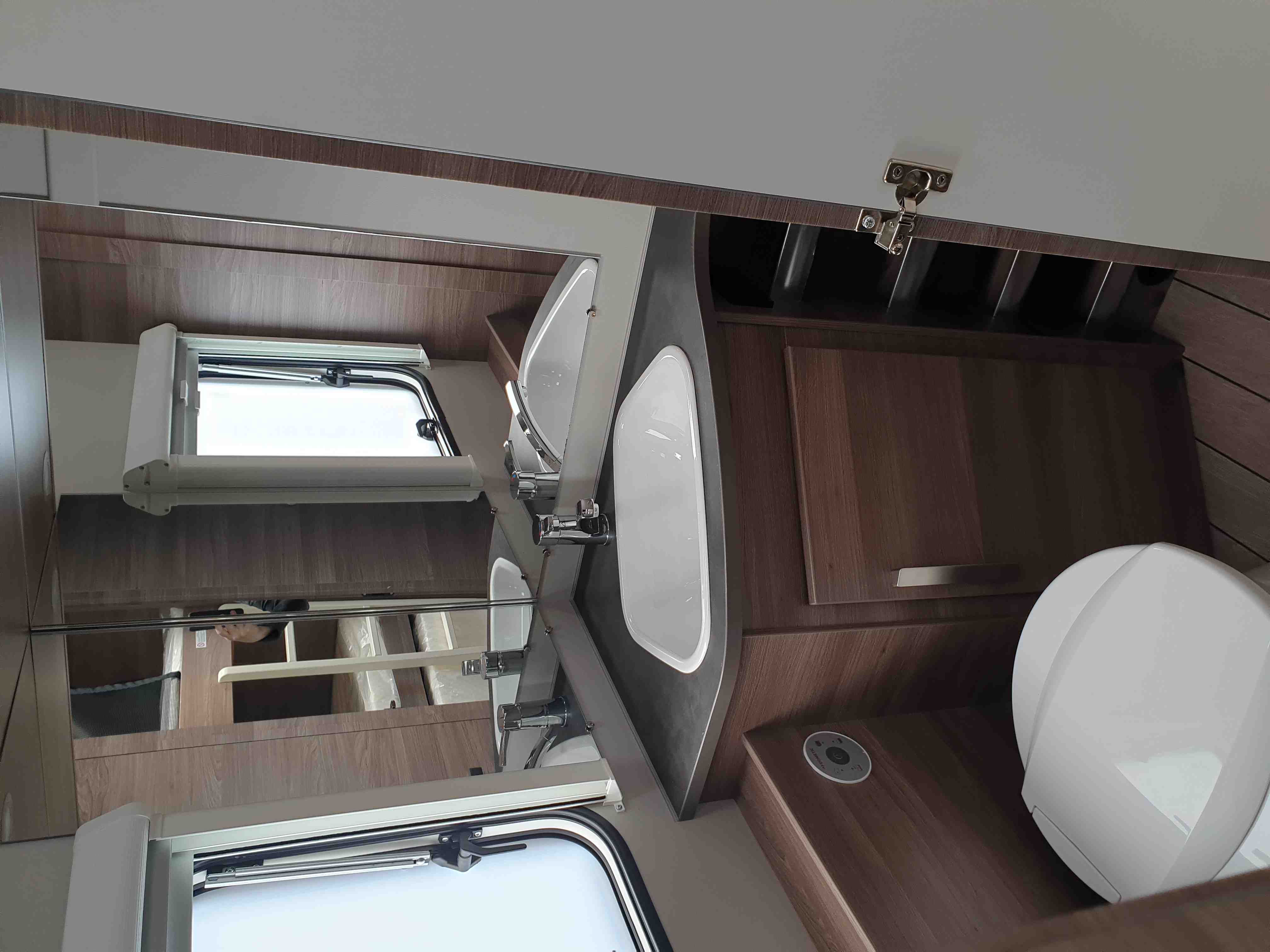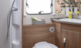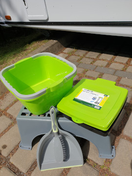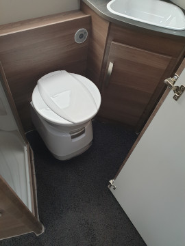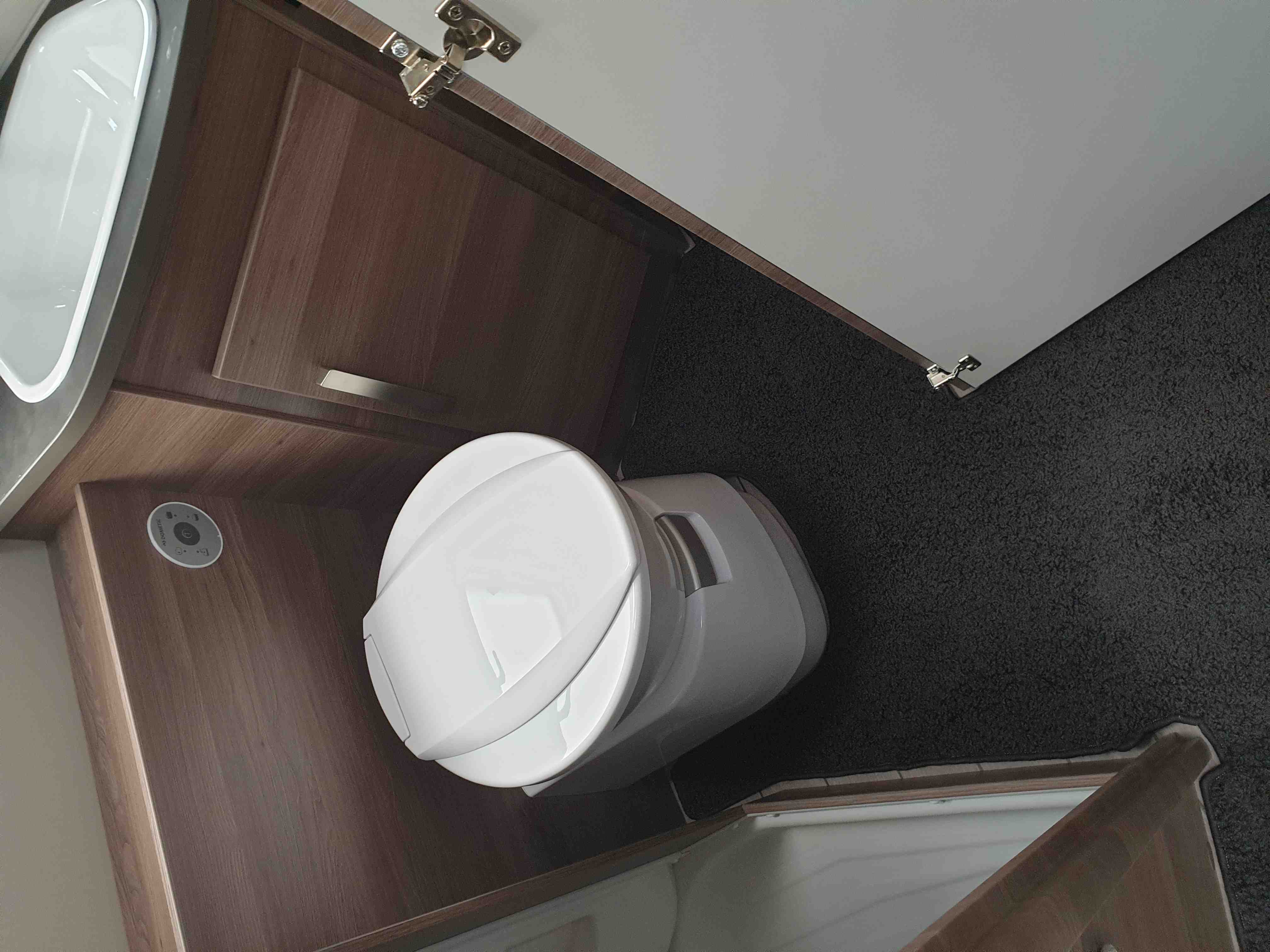 Chemické WC, umyvadlo, zrcadlo i úložný prostor na hygienu